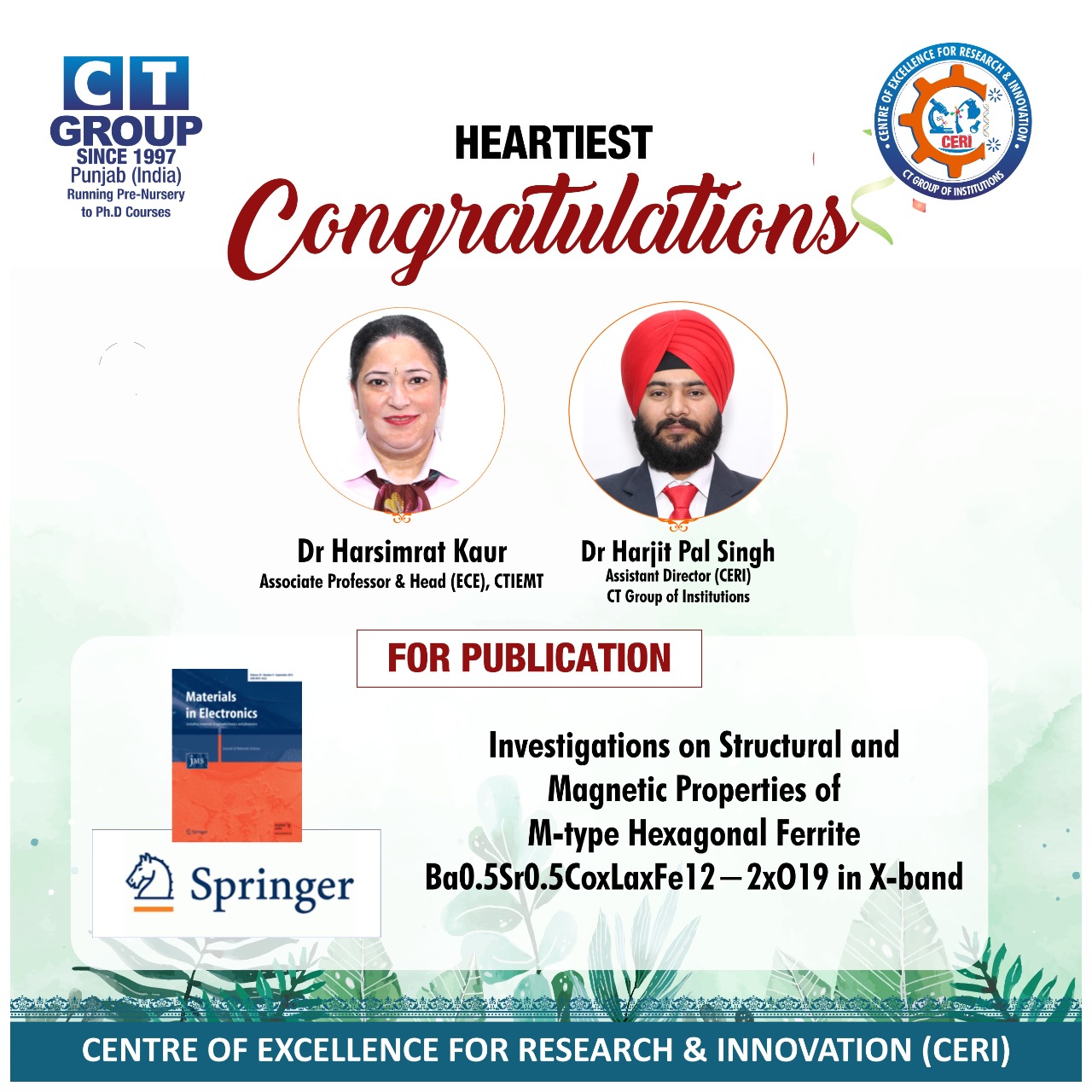 Centre of Excellence for Research and Innovation (CERI), CT Group of Institutions congratulates Dr Harsimrat Kaur, Associate Professor & Head (ECE), CTIEMT and Dr Harjit Pal Singh, Assistant Director (CERI), CT Group of Institutions Jalandhar, for the publication “Investigations on Structural and Magnetic Properties of M-type Hexagonal Ferrite Ba0.5Sr0.5CoxLaxFe12−2xO19 in X-band” with Journal of Materials Science: Materials in Electronics, Springer.