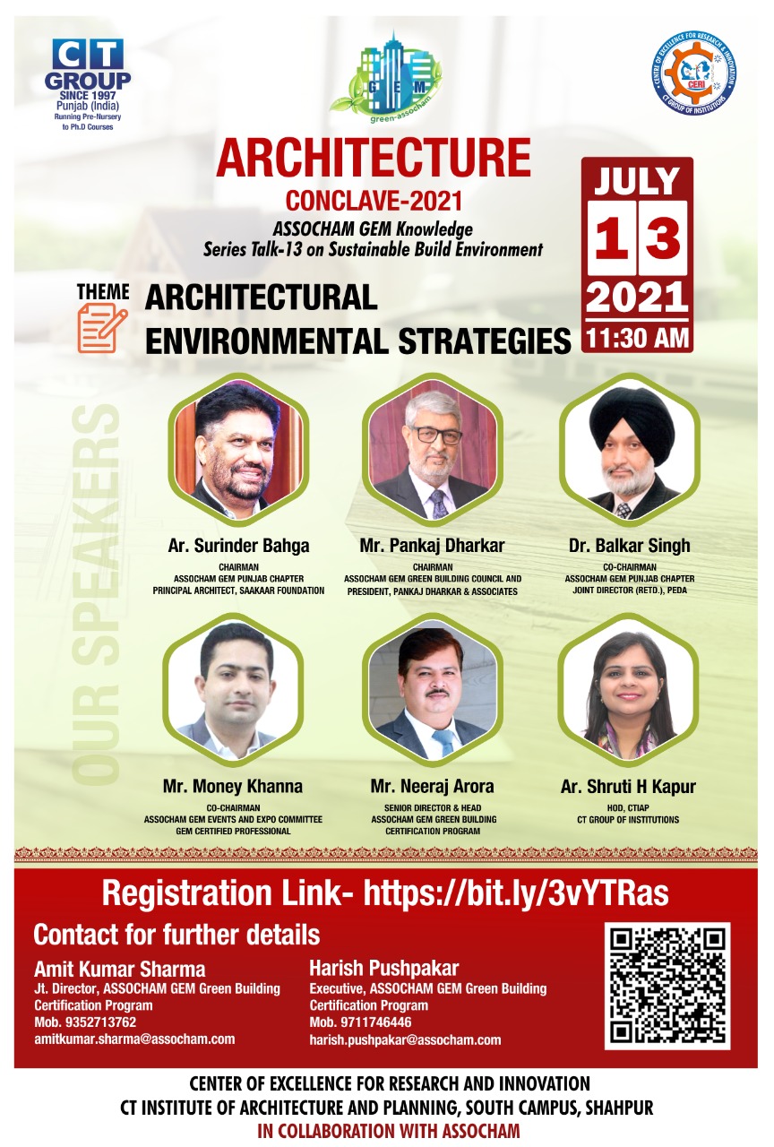 With the new developments and technological improvements, day-to-day architectural and environmental strategies are being revised and optimized. To highlight, trends and challenges in implementation of Architectural Environmental Strategies, Centre of Excellence for Research & Innovation, CTIAP, Jalandhar in collaboration with ASSOCHAM GEM Green Building Council, New Delhi, is organizing a webinar Architecture Conclave- 2021 with the theme of 'Architectural Environmental Strategies' on Tuesday, 13 July 2021 at 11:30 AM.