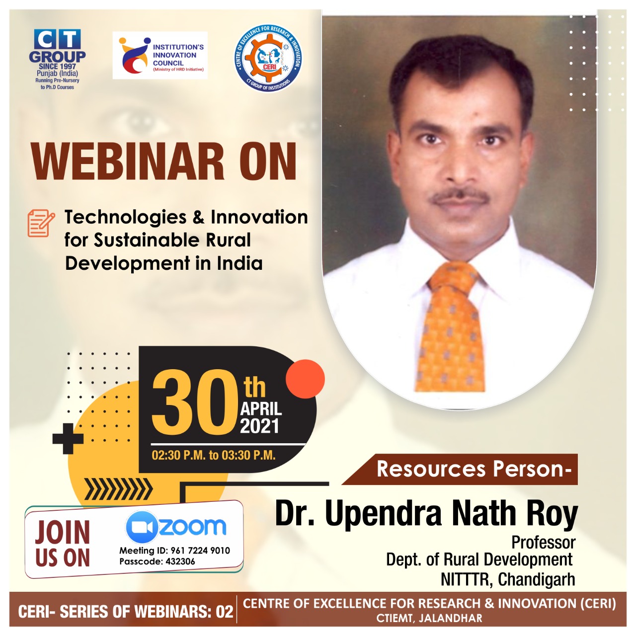 CT Institute of Engineering, Management & Technology under the umbrella of CT Group of Institutions is organizing a webinar on Technologies and Innovation for Sustainable Rural Development in India on April 30, 2021 at 2:30 PM.
