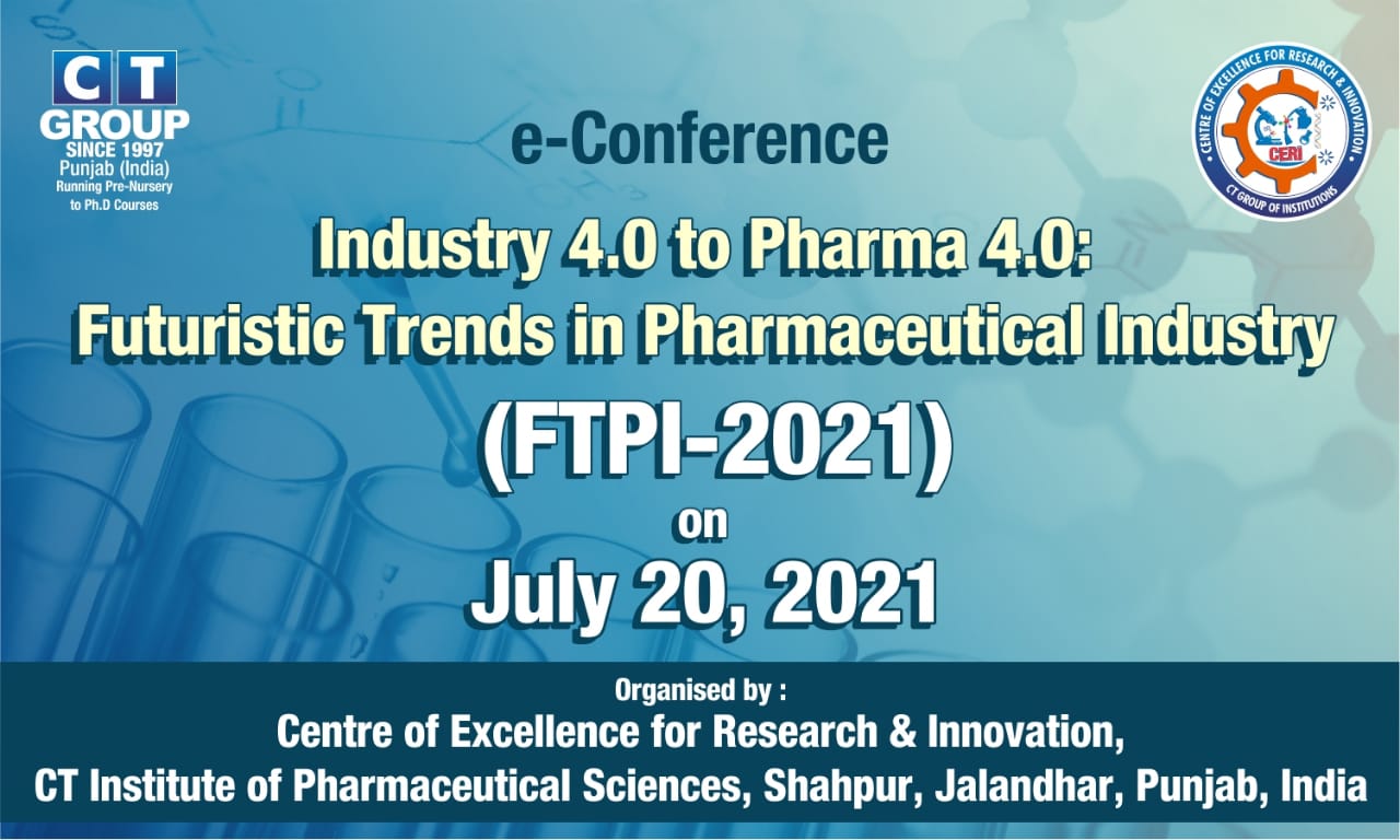 With the evolution of Industry 4.0, the digital transformation of Pharmaceutical Industry has become possible. To highlight issues & challenges for Pharma 4.0, Centre of Excellence for Research & Innovation, CT Institute of Pharmaceutical Sciences, Shahpur, is organizing an International E-conference on Industry 4.0 to Pharma 4.0: Futuristic Trends in Pharmaceutical Industry (FTPI-2021).
