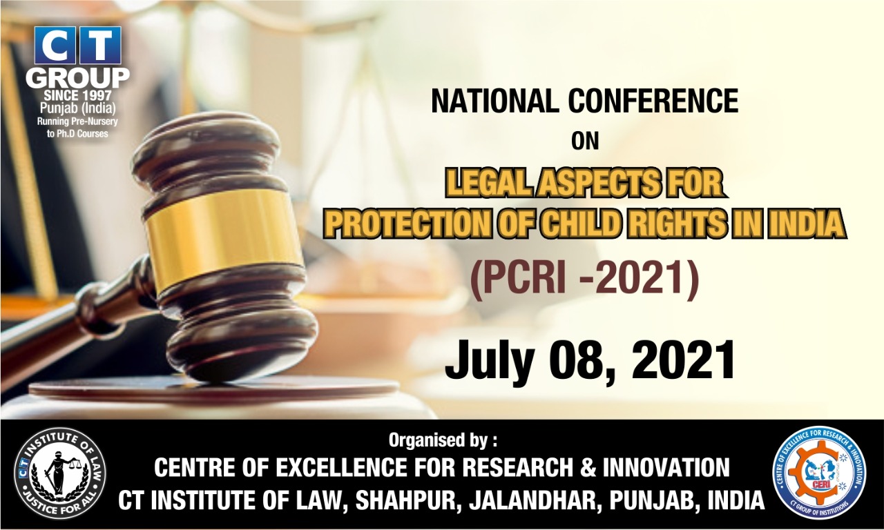 Centre of Excellence for Research & Innovation, CT Institute of Law, Shahpur is organizing a National Conference on the Legal Aspects for Protection of Child Rights in India (PCRI-2021) on July 8, 2021 for the dissemination of knowledge among masses about violence against children or infringement of child rights which are provided by the Constitution of India and also to highlight various initiatives under law through which child rights could be safeguarded.